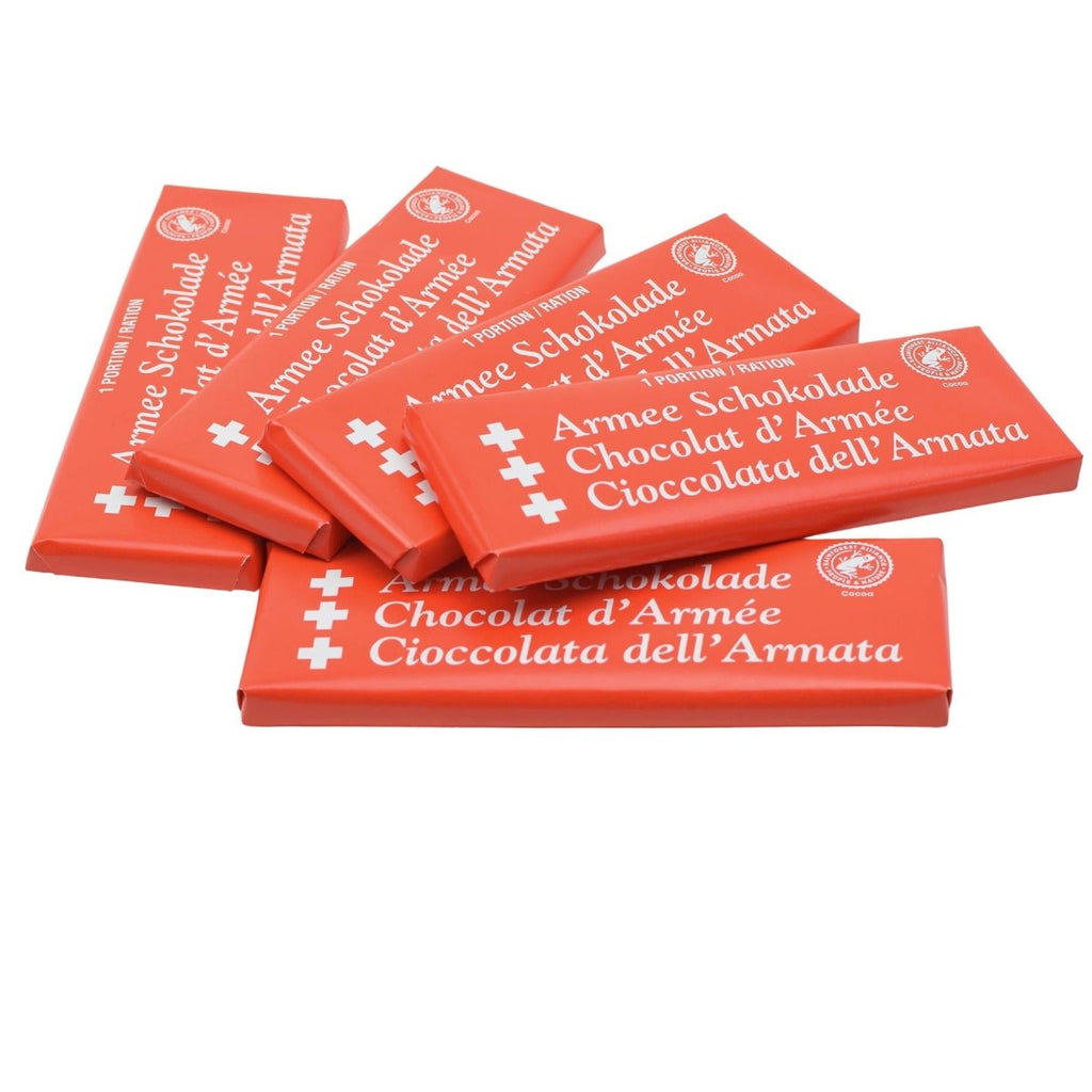 - Parfaite pour les aventures en plein air ou pour un regain d'énergie rapide, cette savoureuse barre de chocolat constitue une gâterie satisfaisante lorsque vous en avez le plus besoin. Avec au moins 35 % de cacao, le chocolat militaire suisse associe des saveurs riches avec une pointe de vanilline pour une expérience délicieuse.