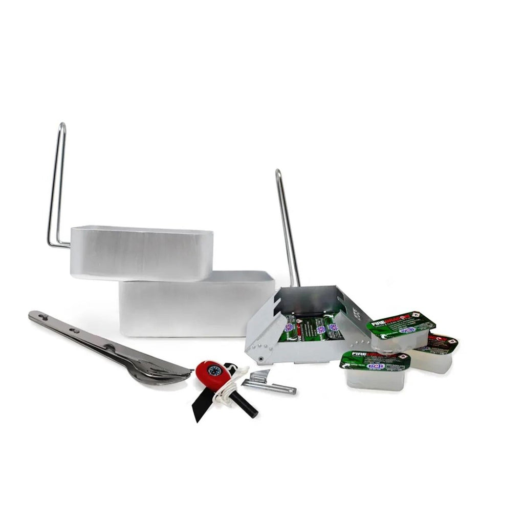 - SET INCLUDES : Poêle, boîtes à désordre, ensemble de couverts, carburant solide, ouvre-boîte, silex, attaquant