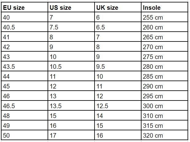 | Taille de l'UE | Taille américaine | Taille du Royaume-Uni | Semelle intérieure |
