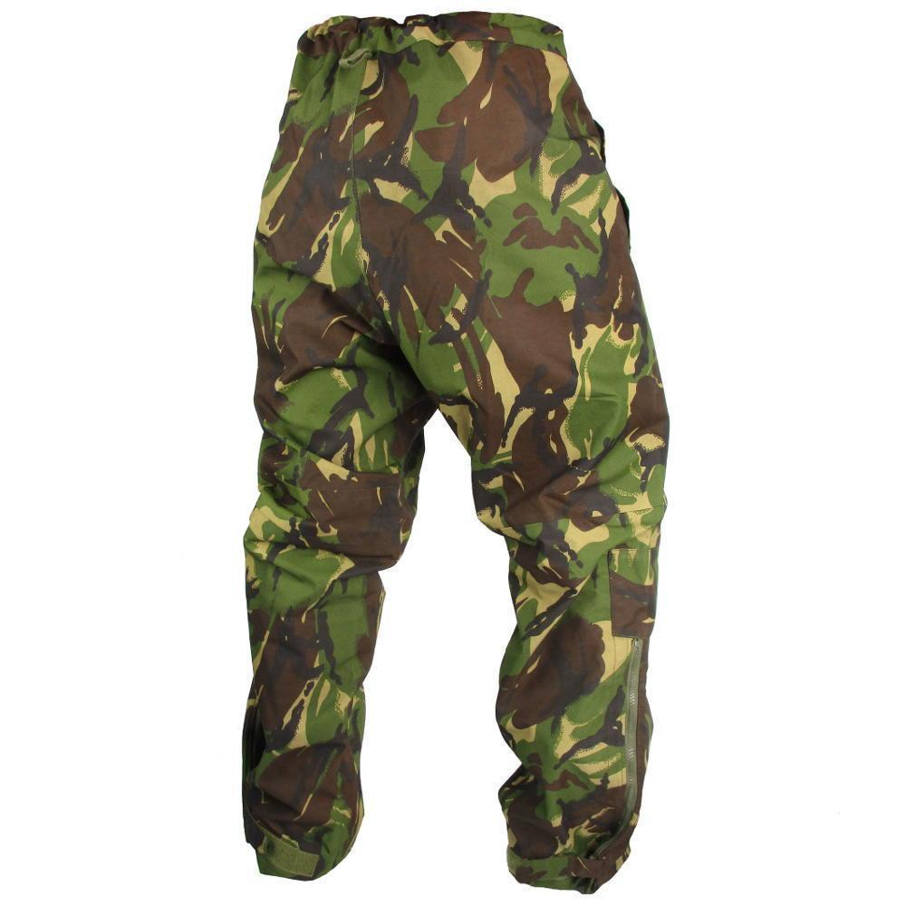 Présentation du pantalon de pluie camouflage DPM original de l'armée britannique – un pantalon militaire en goretex, conçu pour le combat et une utilisation en extérieur.