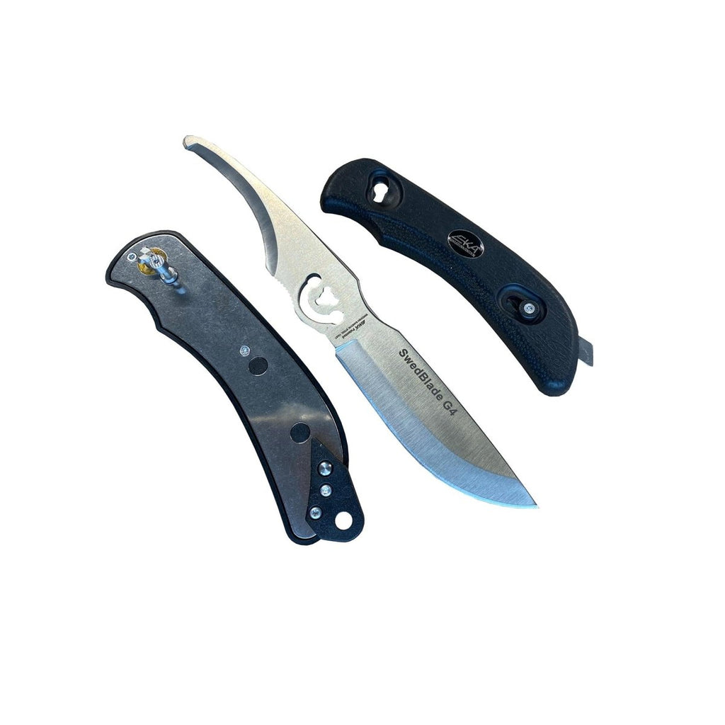 L'EKA® SwedBlade G4 utilise une conception de couteau pivotant à deux lames éprouvée qui permet l'utilisation et la fonctionnalité de deux lames de styles différents incorporées dans un seul couteau. De nombreuses fonctionnalités intéressantes contribuent à faire de l'EKA® SwedBlade G4 le couteau exceptionnel. Il possède une poignée ergonomique bien conçue. Les lames sont fabriquées à partir d'une conception monobloc en acier de haute qualité approuvé par EKA, ce qui contribue à offrir une durabilité et des bords durables qui maintiennent leur tranchant. Basculez rapidement entre la lame de dépouillement et la lame d'éviscération d'un simple mouvement fluide lorsque le bouton de verrouillage est enfoncé. Simplement et sans outils, cliquez pour démonter/assembler le couteau à deux lames pour le nettoyer après chaque utilisation. Il dispose également d'un point d'attache pour une longe afin de maintenir votre EKA® G4 avec vous et là où il doit être.