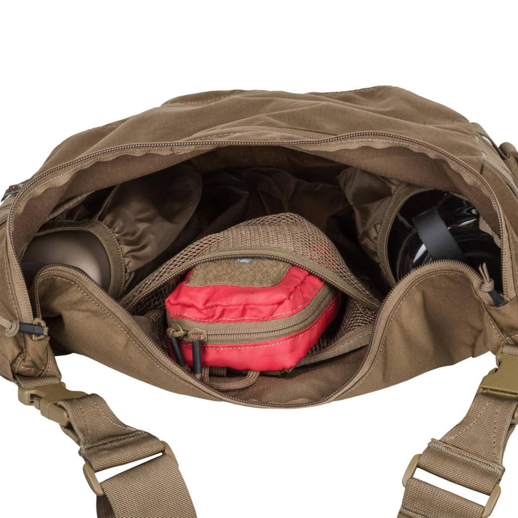 Avec une chambre principale spacieuse qui comprend une poche en filet zippée pour les objets de valeur et deux poches élastiques à cordon pour les bouteilles d'eau, le Bushcraft Satchel® vous garantit de pouvoir transporter facilement tous vos essentiels.