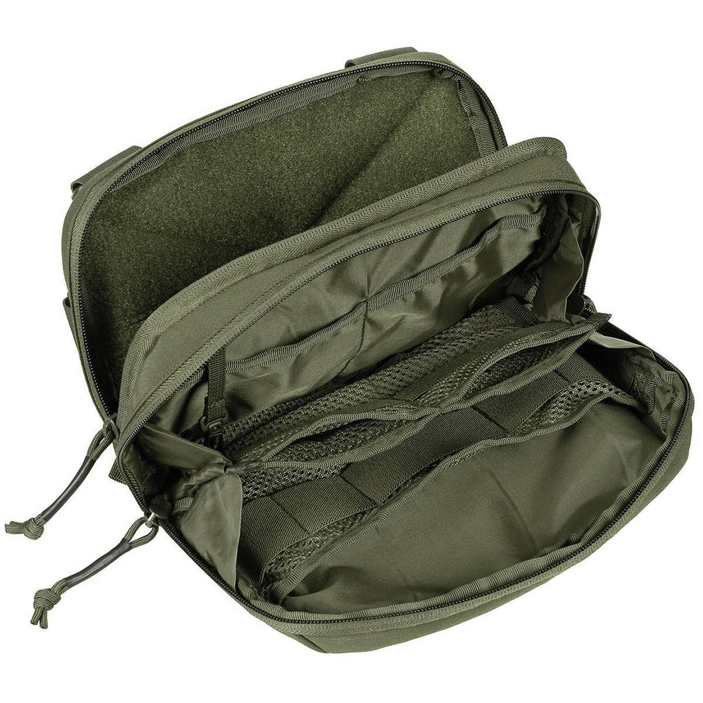 Le compartiment arrière est doté d'une fermeture éclair bidirectionnelle et comprend des boucles élastiques ainsi qu'un grand panneau auto-agrippant adapté aux organisateurs supplémentaires. Le compartiment principal se ferme également avec une fermeture éclair bidirectionnelle et offre un séparateur en maille, des compartiments sur les manches, des boucles élastiques, des boucles de fixation et un mousqueton. La section avant comprend une poche zippée, un compartiment sur la manche avec fermeture auto-agrippante et des boucles de fixation Molle externes. Les tirettes extra longues garantissent une manipulation facile, même avec des gants.