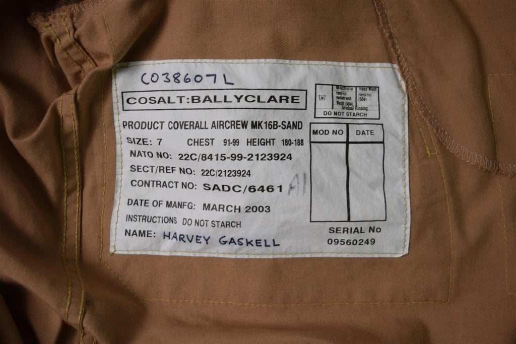La combinaison British Military Aircrew MK 16 B RAF de couleur beige est une combinaison de vol d'une seule pièce conçue pour être utilisée par le personnel navigant de la Royal Air Force. Il est fabriqué à partir d'un tissu durable et léger qui offre protection et confort pendant les opérations aériennes. La combinaison comporte de nombreuses poches et fermetures éclair, ce qui la rend pratique pour transporter des équipements essentiels et des objets personnels. Il est également doté de poignets, de taille et de chevilles réglables pour un ajustement sûr et confortable. La couleur beige de la combinaison contribue à assurer le camouflage dans certains environnements.