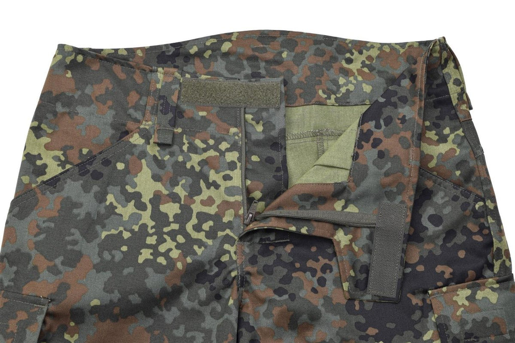 Présentation du pantalon tactique Leo Kohler pour hommes en camouflage explore flecktarn, conçu avec une taille plus haute pour plus de confort et de fonctionnalité.