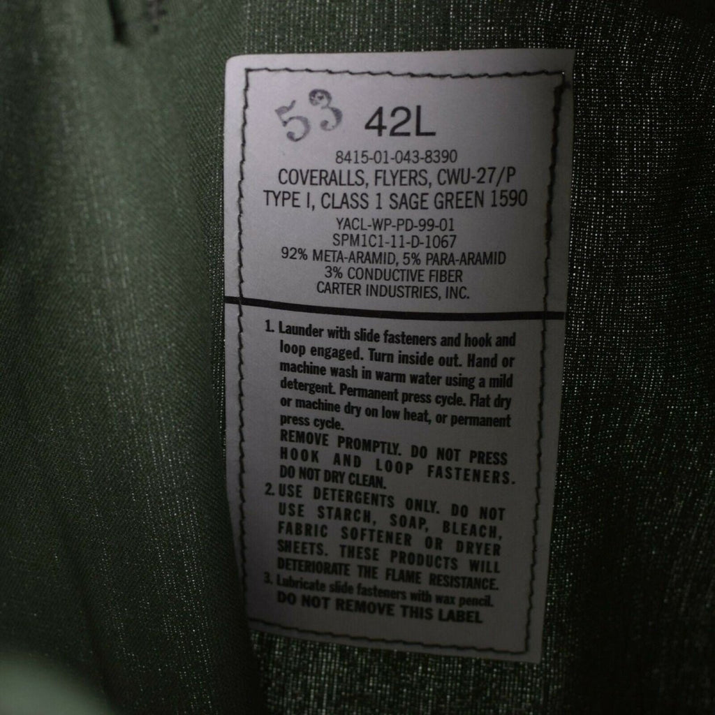 Combinaison de vol authentique de l'armée américaine USAF CWU-27/P en nomex vert résistant au feu