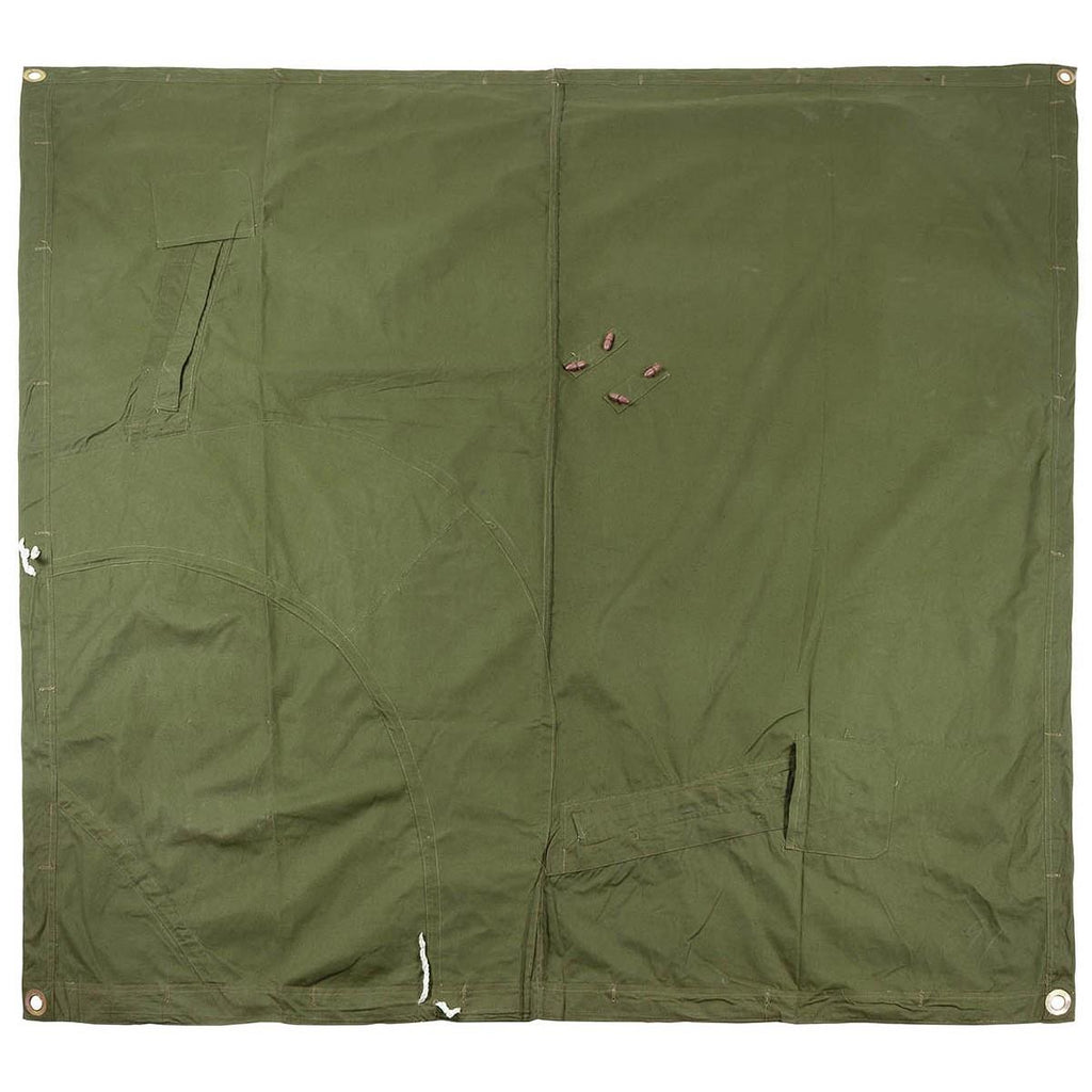 Ce morceau de tente en bâche imperméable est fait de toile de coton et comporte des boutons et des trous de serrure appariés. Il peut être boutonné à d'autres demi-abris pour former des tentes petites ou grandes. Il peut également être porté comme une cape/poncho de pluie imperméable, cela forme la base de la capuche, tandis qu'il vous suffit de boutonner le devant et de passer vos bras à travers les fentes d'ouverture.
