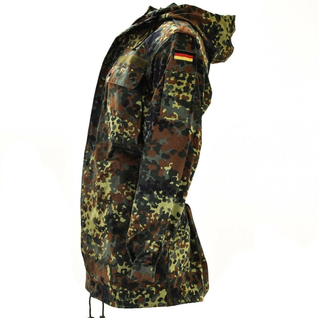 Présentation de la parka militaire allemande originale, une parka camouflage flecktarn incontournable pour les amateurs de plein air. Cette veste camouflage présente le motif camouflage flecktarn distinctif, ce qui la rend à la fois élégante et fonctionnelle. Avec sa capuche pour une protection supplémentaire contre les éléments, cette parka vous assure de rester au chaud et au sec.